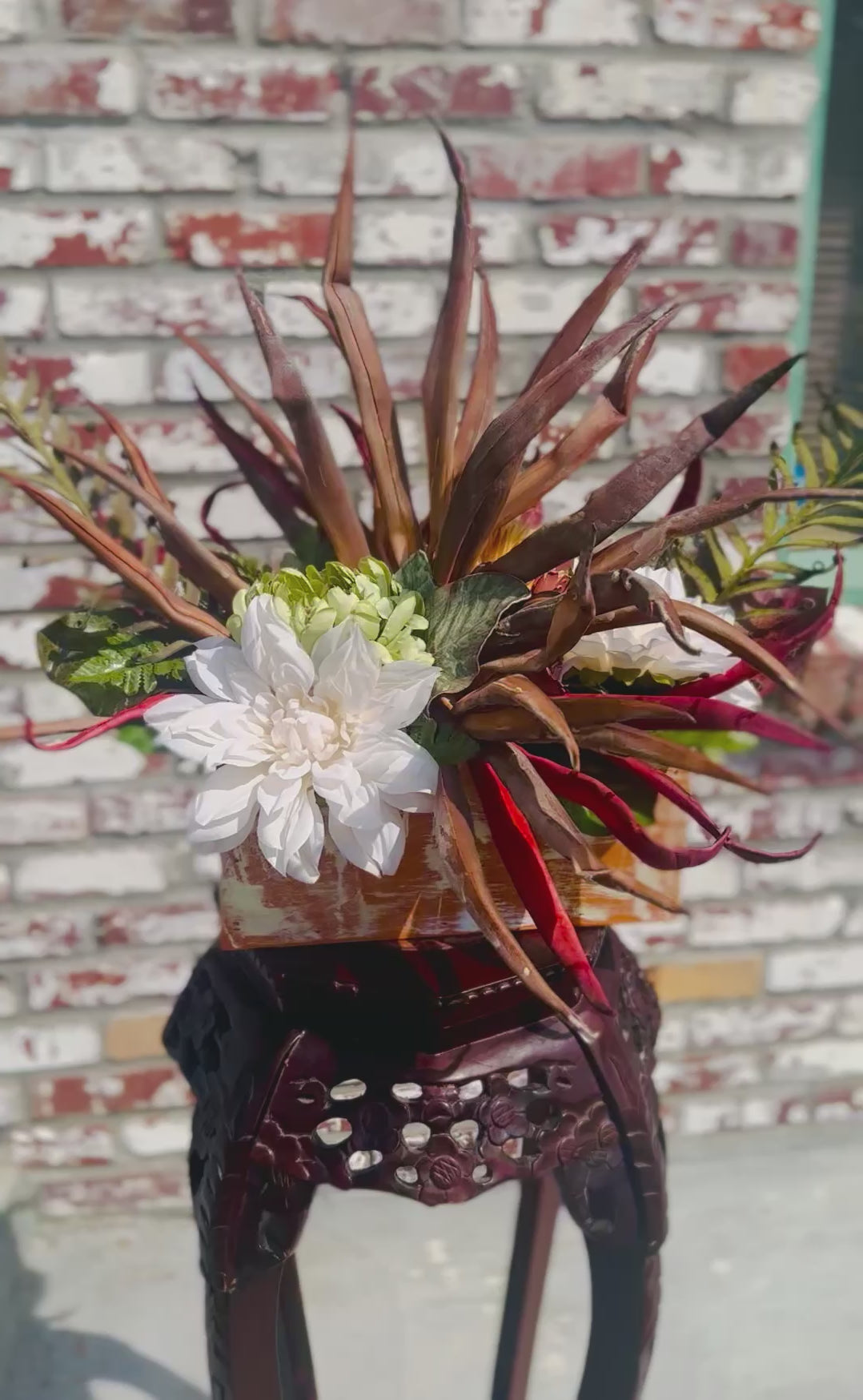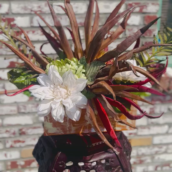 Turn heads with this handcrafted rustic desert-inspired floral arrangement, featuring bold spiky palm fronds, a lush white dahlia, pops of greenery, and warm red accents. Nestled in a distressed wooden planter box, this piece blends farmhouse charm with modern desert style.