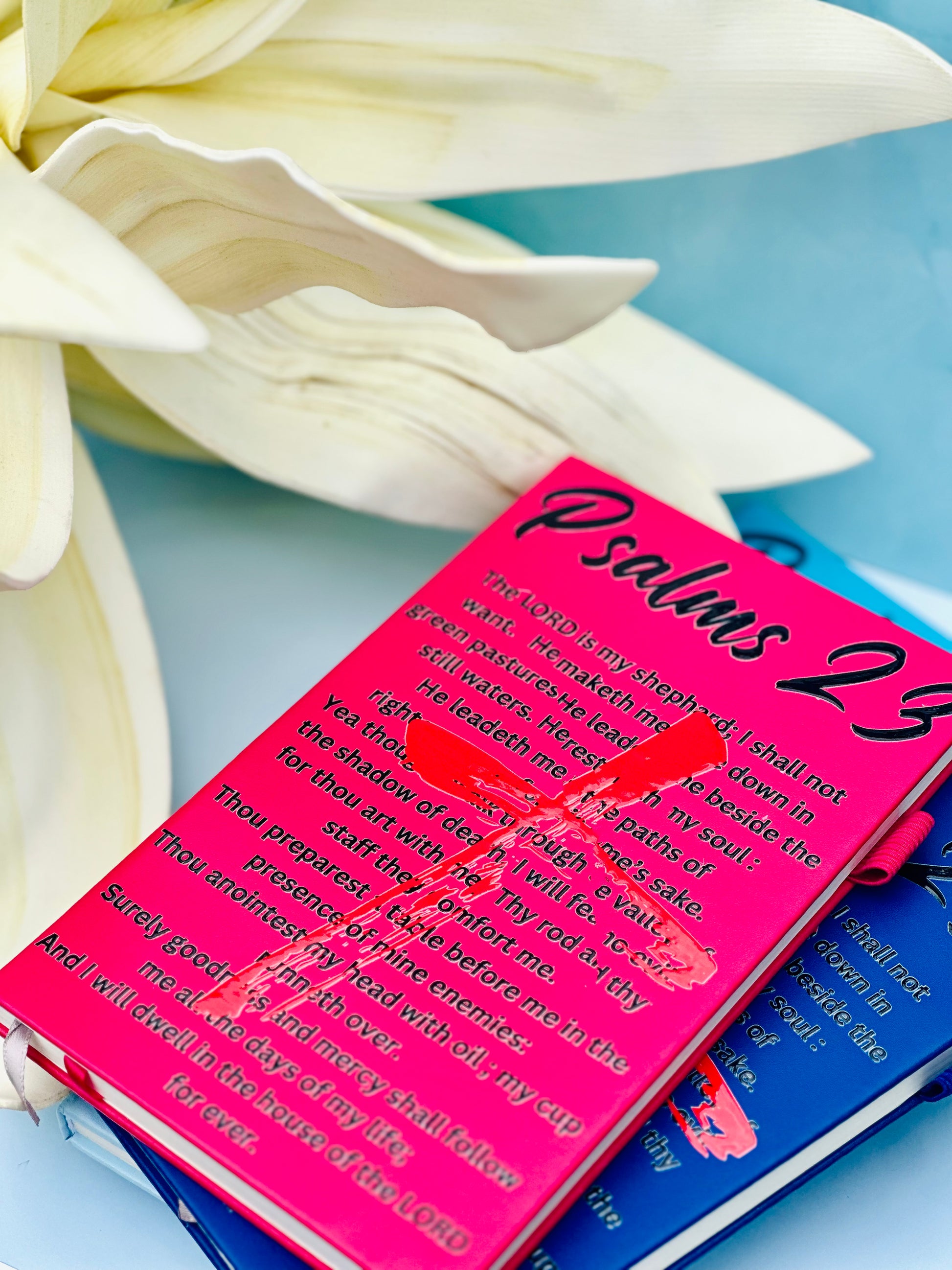 Find strength, peace, and purpose with every page. This Psalms 23 Writing Journal features the beloved scripture in bold print, overlaid with a vibrant red cross—perfect for journaling, prayer notes, Bible study reflections, or daily inspiration.