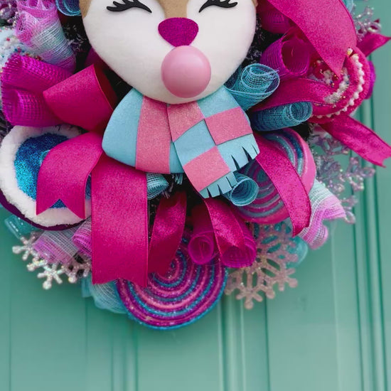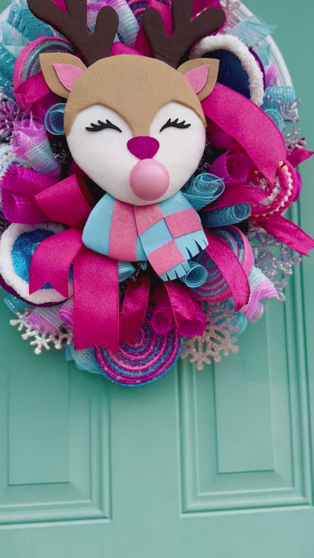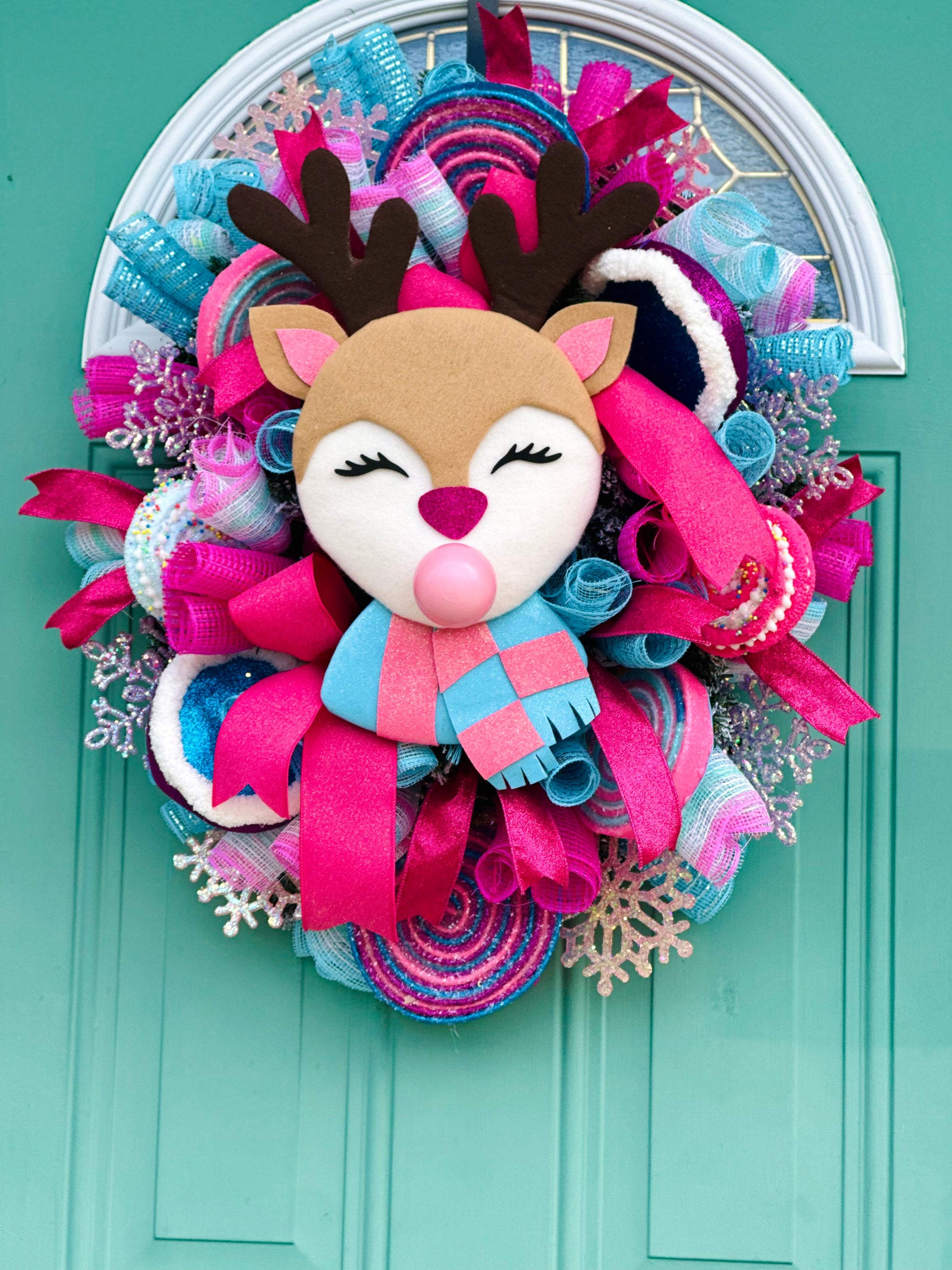 Handcrafted with love, shimmer, and a dash of candy-coated charm, this wreath features a soft felt reindeer centerpiece with fluttery lashes, candy swirl details, and sparkling pink-and-blue ribbons that pop with festive cheer.